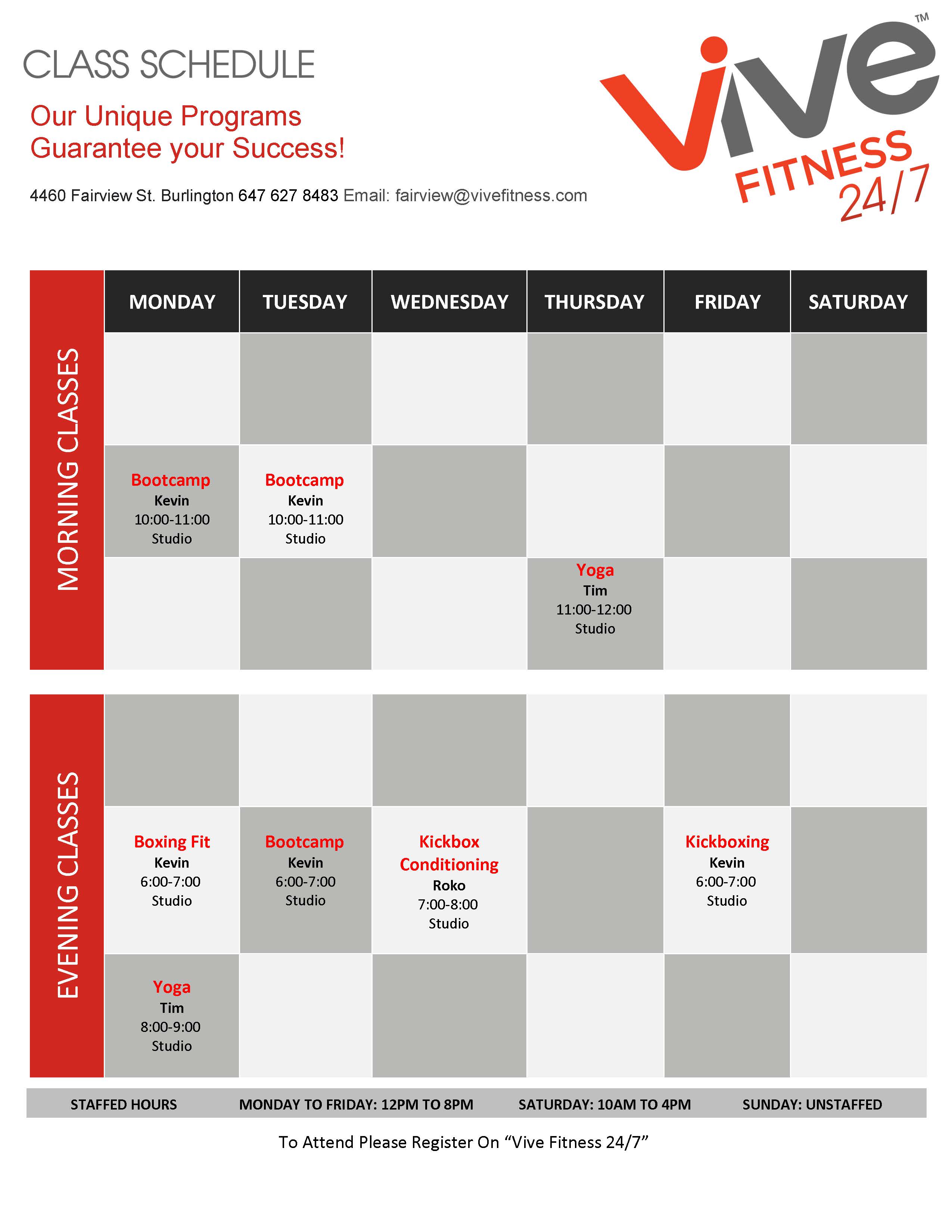 fairview class schedule Our Unique Programs Guarantee your Success! Open 24/7 | Motivating Atmosphere | No-Contract Membership 4460 Fairview St. Burlington, ON