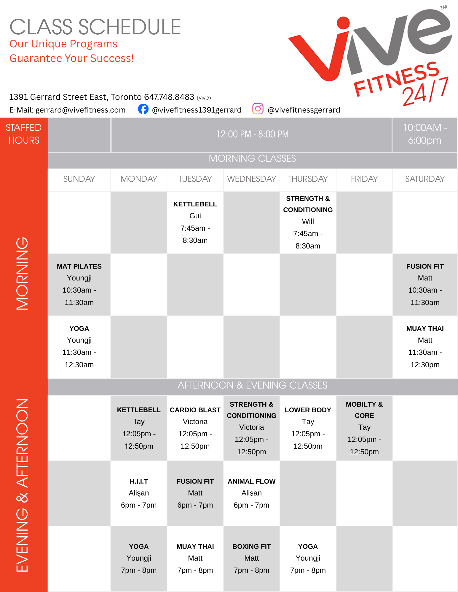 Staffed Hours Monday-Friday | 12pm-8pm Saturday | 10am-6pm Sundays & Holidays | Unstaffed 647.748.8483 gerrard@vivefitness.com