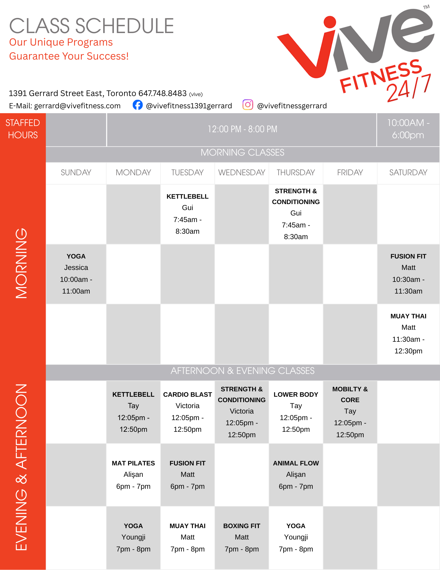 Staffed Hours Monday-Friday | 12pm-8pm Saturday | 10am-6pm Sundays & Holidays | Unstaffed 647.748.8483 gerrard@vivefitness.com